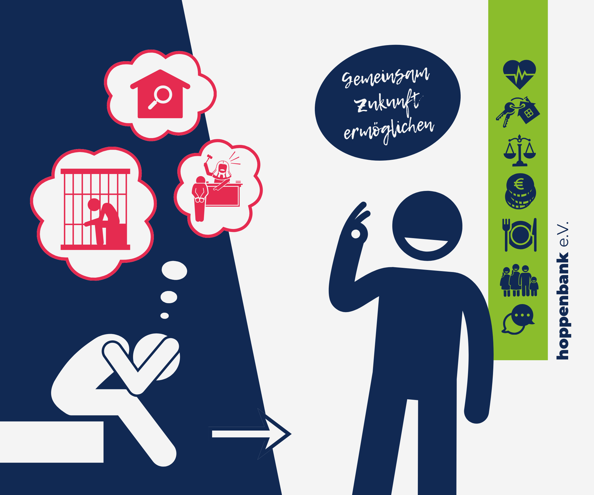Bei hoppenbank e.V. begleiten wir Menschen, die von Straffälligkeit, Wohnungslosigkeit oder sozialen Herausforderungen betroffen sind. Mit einer akzeptierenden Haltung begegnen wir ihnen ohne Vorurteile oder Schuldzuweisungen, erkennen ihre Stärken und unterstützen sie dabei, ihre Lebenssituation Schritt für Schritt zu verbessern. Wir bieten Beratung, Betreuung und praktische Hilfen und setzen auf individuelle Förderung, gesellschaftliche Teilhabe und schaffen nachhaltige Perspektiven.